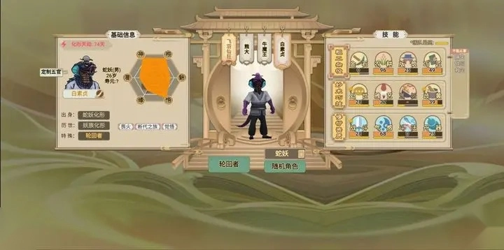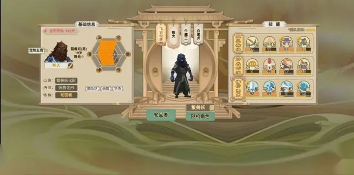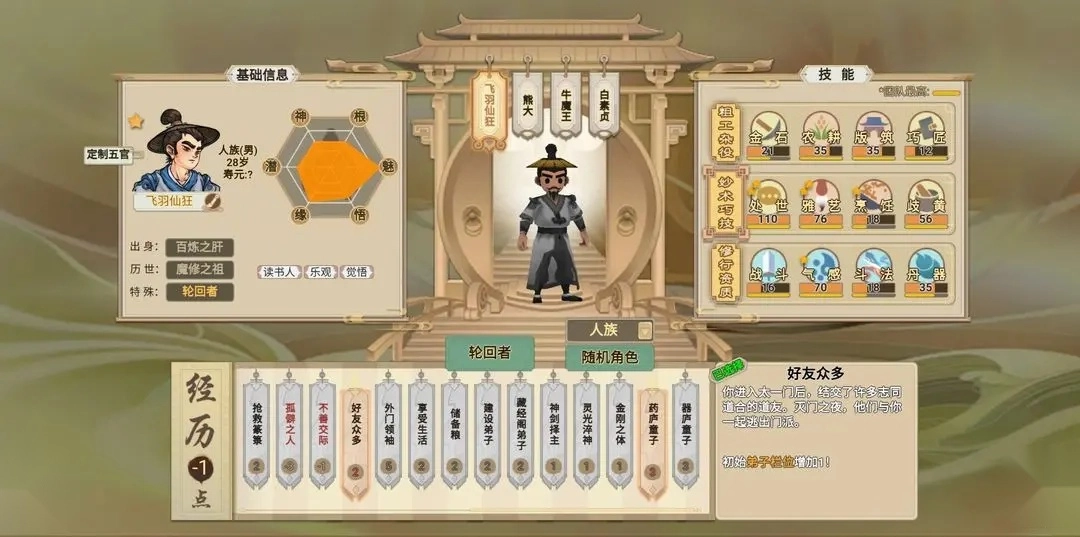 第3-4天(划重点):一号小人画完6张符后,用所得的参悟点学习化伤术;接着把异闻符替换成轻身符,给自己用五次化伤术来提升心情;之后带上弓去击杀蜚妖;再找等级高的膳夫进行屠宰(记得先存档,要刷玄牝珠——可以造个小冰库存放易腐烂物品,另外妖灵血会着火,摆放时得注意);最后让一号小人录功法(期间吃个龙涎果子)