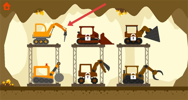 在挖掘机选择界面,挑选第一台挖掘机,然后进入游戏关卡。