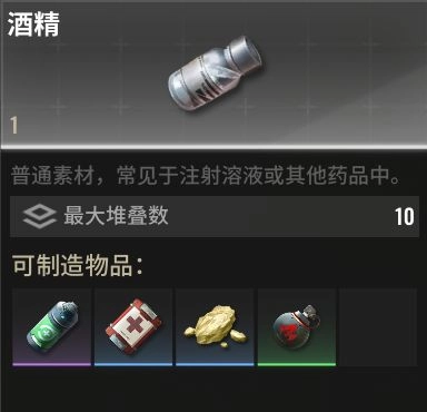 在红滩战场上行动,受伤是常有的事。要是能自己生产药品自己治疗,那可就太舒服了!酒精可以用来制作急救包和再生药剂,在对局里很容易捡到,实用性和获取难度的性价比特别高,每个玩家都应该备着它。