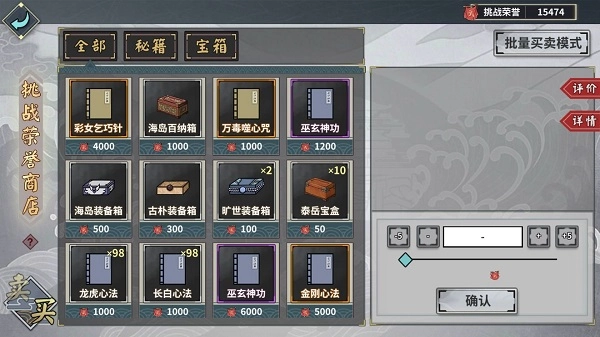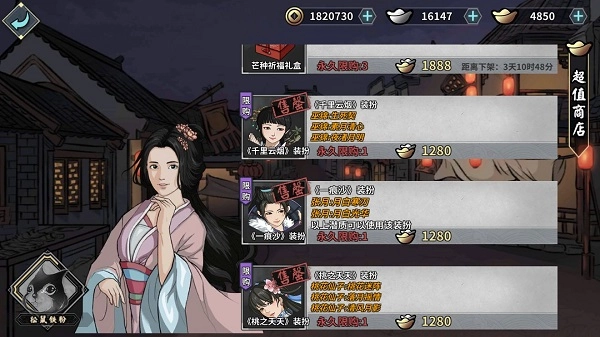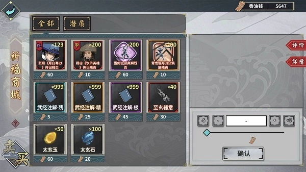 如上图所示,绝和武经注解·极都是值得优先入手的选择,但如果是刚接触的萌新,暂时不用考虑购买侠客和武学相关的物品。建议先专注购买武经注解·极,等积累到差不多800本极之后,再去考虑侠客和武学的购买需求——800本极的数量,只要不使用张月和野驴这两个角色,是完全足够的。需要注意的是,香油商店里优先选择绝和武经注解·极这两类物品,其他商品一般不建议购买,除非遇到出售的甲类武学强度很高,而你恰好又没有该武学的情况(比如甲品质白衣对应的武学)。