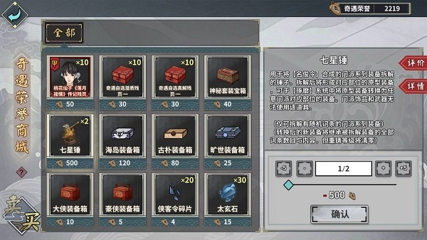 接下来是奇遇商城:奇遇商城的规则就简单多了,主要可以购买名俊令、太玄玉、太玄石、奇遇自选残页,还有七星锤(这个道具萌新暂时用不上,等你对游戏玩法熟悉之后,自然就明白它的用途了)