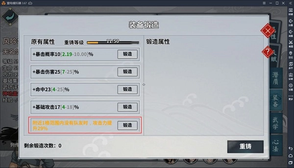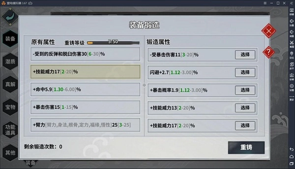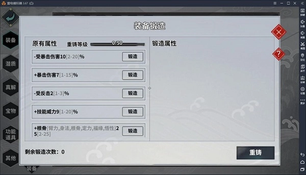 重铸能够提升属性下限,强化装备的基础属性。每日前8次重铸是免费的,之后继续重铸就需要收费了——最顶级的装备每次重铸要25元宝,低级一点的装备则是17元宝一次。