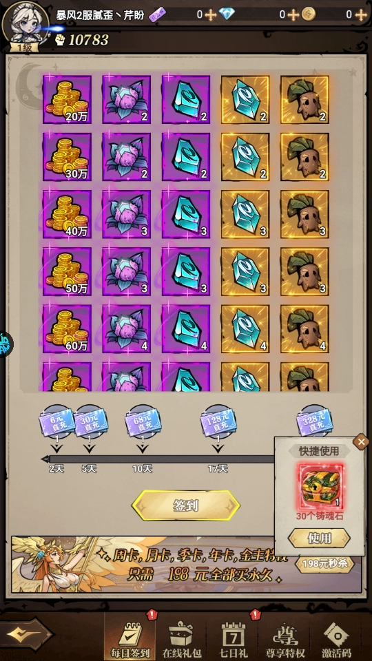 1、每日签到,可以领取金币、钻石等福利奖励;