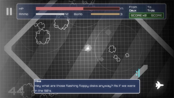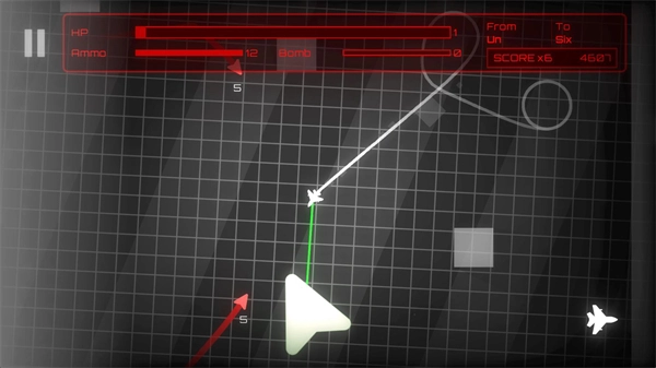 4、正式开始后,点击屏幕左右两侧可控制飞行方向,同时按住两边屏幕则能发射子弹,摧毁敌人与障碍物。屏幕上方的HP代表血量,Ammo是弹药量,Bomb为炸弹数量。
