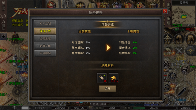 4、称号晋升:消耗称号卷轴与金币即可完成提升,提升后将增加对怪物的伤害、暴击率等属性。