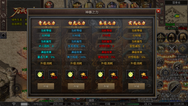 3、神兽之力:消耗神兽精华与金币,即可提升四象之力,其中青龙对应暴击属性,白虎对应体力属性,朱雀对应基础倍攻属性,玄武对应对怪吸血属性。