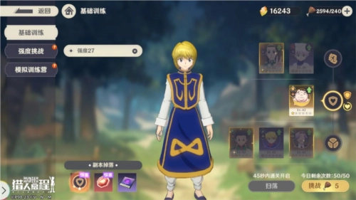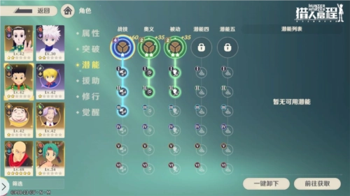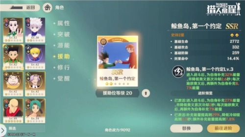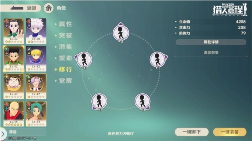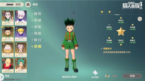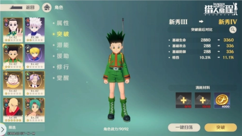 此外,主角团的四位成员(小杰、奇犽、雷欧力、酷拉皮卡)拥有专属的养成机制,通过该机制,SR品质的主角团四人能够升级为SSR品质,同时解锁全新的形象。