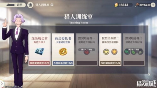 猎人训练室设有“默契培养课”“竞级成长营”和“商会委託书”三个板块,通过参与这三个板块,玩家分别能获取“援助升级材料”“角色升级卡”以及海量游戏内货币“戒尼”!热衷于培养心仪角色的玩家可千万别错过这个机会!