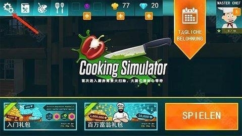 1、进入料理模拟器游戏的主界面后,点击左上角的“齿轮”按钮。