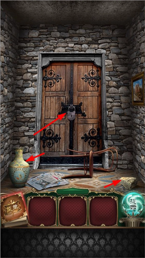 2、到了第二关就没有提示了,我们得先捡起右边的石头,用它打碎左边的花瓶,这样就能拿到钥匙,再用钥匙打开大门,就能进入第三关了。