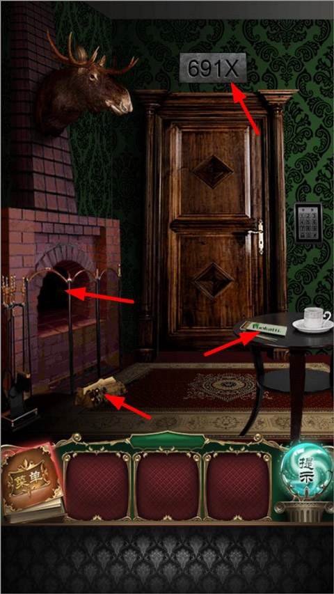 4、来到第四关,首先要从左边火炉旁取来木柴,接着去右边桌子上拿到火柴,之后把木柴放进左边的火炉里,再用火柴将其点燃。这时能看到火炉壁上显示着数字4,而这一关的密码是6914,输入密码打开门后,就可以进入第五关了。