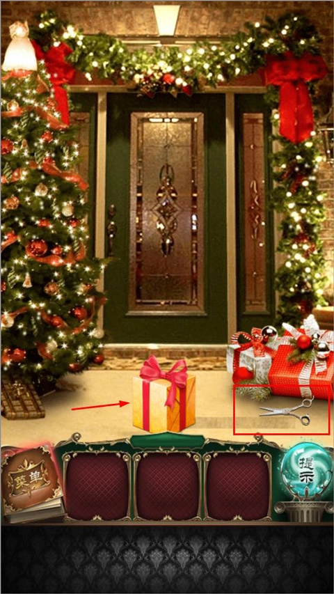 7、到了第七关,我们先把右侧的礼物挪到中间位置,这时能看到地上有一把剪刀。接着用这把剪刀拆开中间的礼物,从中取出一把钥匙,用钥匙打开大门。大门开启后,就可以进入第八关了。