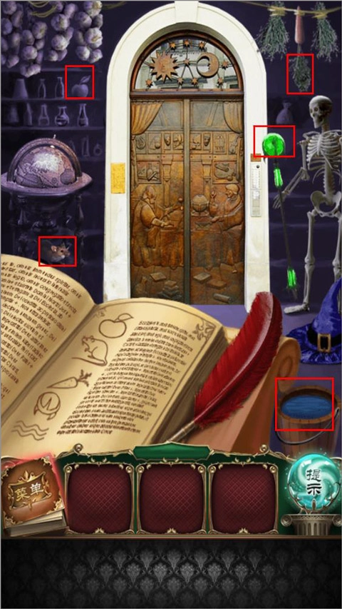 6、第六关是一个寻物游戏。首先在左边的架子上找到一颗苹果并拿取,接着在下方找到一只老鼠并拿取,然后到右边拿上胡萝卜,再取下骷髅上的宝石,最后点击水,门就会打开,这样就能进入第七关了。