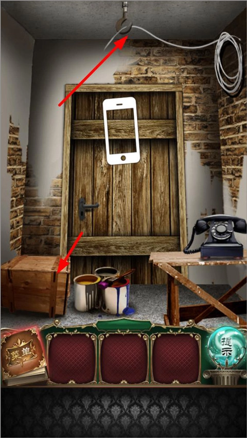 10、第十关,这一关我们需要晃动手机,让一个铁球掉落下来,接着用这个铁球砸破左边的箱子,从中获取一把钥匙,再用这把钥匙打开中间的门。