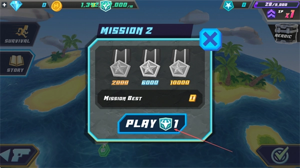 1、在任务界面找到Mission2选项并点击,接着按下PLAY按钮进入该关卡,本关的目标是通过积累分数来获取对应的勋章。