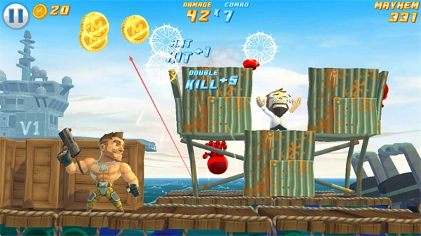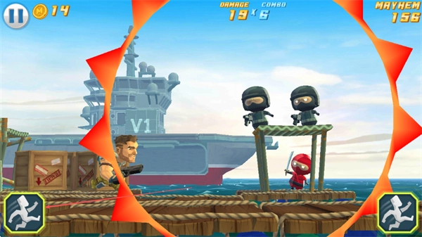 2、在木筏场景中对忍者类敌人进行射击,通过触发如19×6这样的连击,来积累伤害值与MAYHEM值。