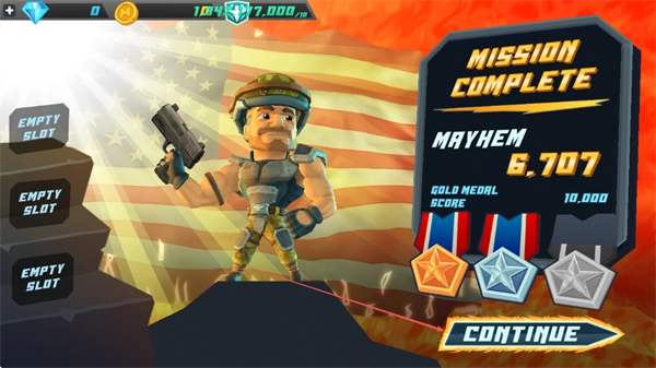 4、把所有敌人都消灭之后,就能完成关卡要求,拿到10000的金牌分数,此时点击CONTINUE按钮就可以接着挑战下一关。