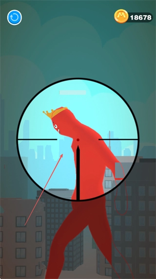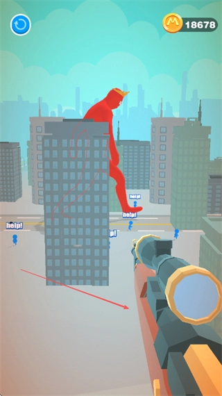 1、操控狙击枪对准城市里的红色巨人,伺机寻找最佳的射击时刻。