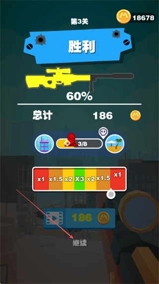 4、关卡获胜后,领取金币奖励,点击继续按钮进入下一关,继续进行挑战。