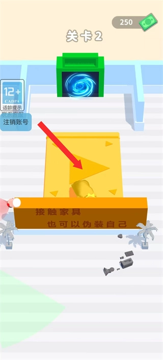 2、游戏中依照箭头指引,让角色触碰家具完成伪装,匹配场景元素以隐藏自身,朝着躲避追捕的目标前进。
