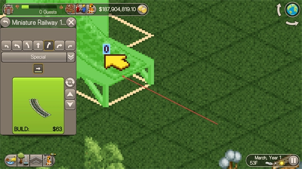 2、进入轨道搭建界面,选择轨道部件如弯道,花费$63放置到对应区域,规划铁路路线。
