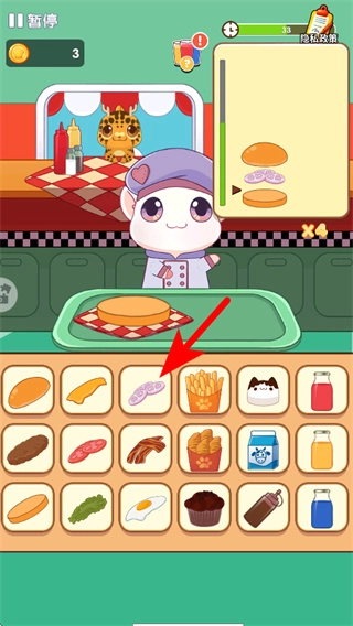 2、根据订单需求如汉堡,点击对应的食材如面包片,将其添加到托盘上,逐步组装食物。