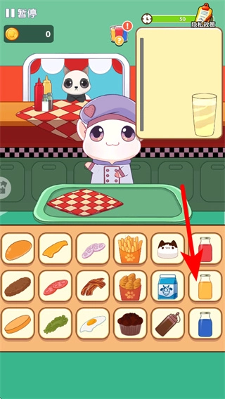 4、若订单需求为饮品,可点击橙汁等对应的饮料,将其添加至托盘,以此完成饮品制作并推进流程进度。