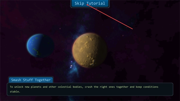 1、在教程界面可点击SkipTutorial跳过引导,也可按SmashStuffTogether提示,碰撞对应天体解锁新天体并维持状态稳定。