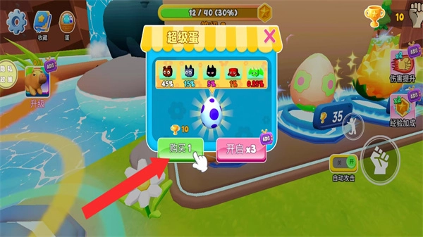 4、在超级蛋界面点击购买1按钮,消耗金币开启蛋,获取新角色或道具,增强游戏能力。