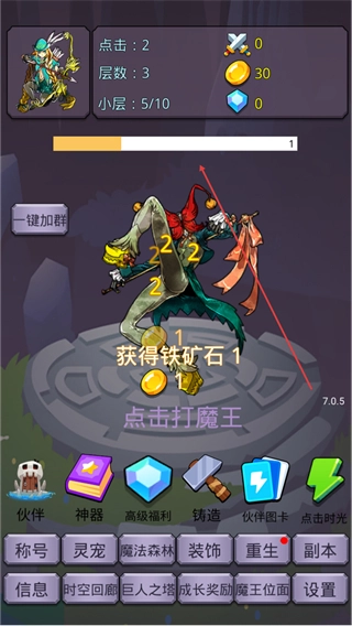 1、点击打魔王按钮攻击当前魔王,获取铁矿石与金币,提升层数进度。