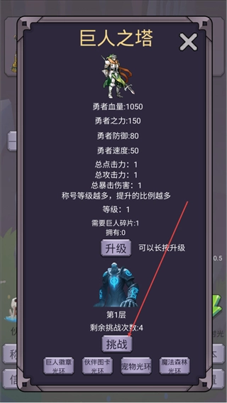1、进入巨人之塔界面,查看勇者属性后点击挑战,进入第1层战斗。