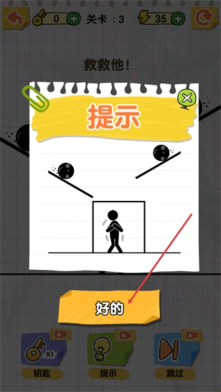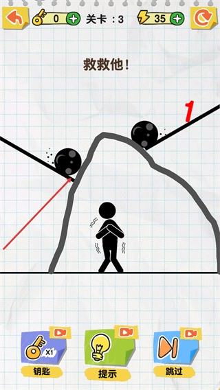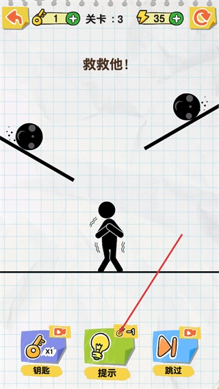 1、处于关卡3场景,看到救救他提示,两侧黑球即将滚落,可点击底部提示功能获取通关的画线指引。