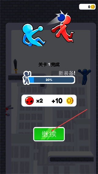 4、界面显示关卡1完成,获得对应奖励与新装备,点击绿色的继续按钮可进入后续关卡。