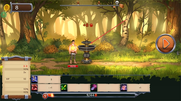 4、靠近界面中的喷泉,触发效果可获得+8的增益提升自身状态后,点击播放按钮继续游戏进程。