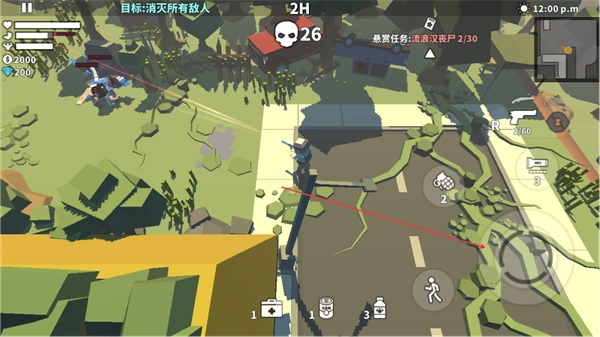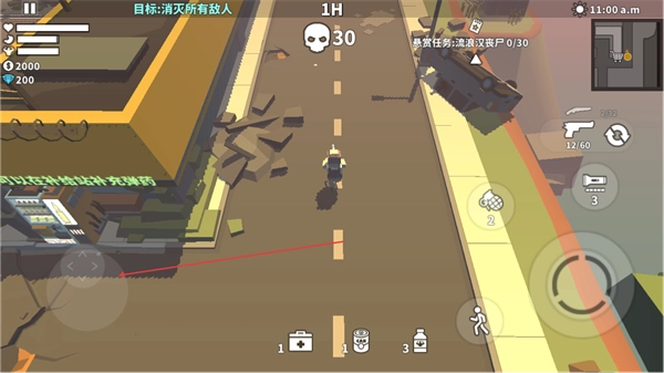 1、操控角色在街道移动,利用右侧武器如枪械瞄准敌人,攻击丧尸,推进消灭所有敌人的目标。