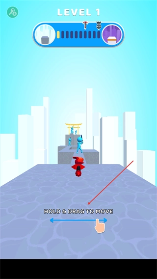 1、在关卡初始界面,通过按住并拖动的方式控制角色移动,以此调整行进路线,避开潜在阻碍或靠近目标物品,为后续的武器收集与战斗操作做好铺垫。