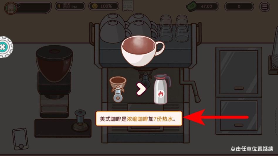 2、查看美式咖啡的制作提示浓缩咖啡加7份热水,明确制作配方后继续操作。