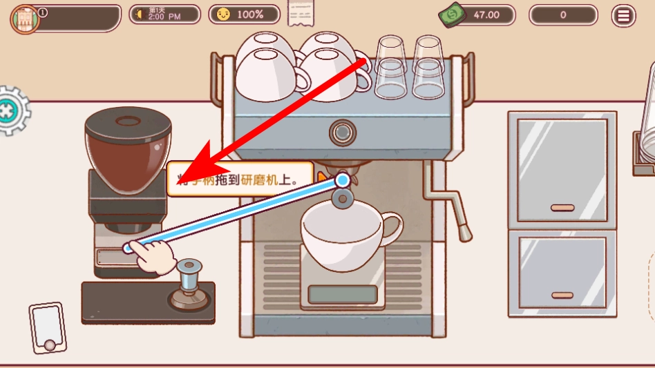 3、根据指引把手柄拖至研磨机处,启动咖啡研磨程序,以此为制作浓缩咖啡做好准备。