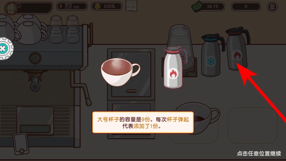 5、按照提示操作,取用带有火焰标识的热水壶,往盛有浓缩咖啡的杯子里注入热水,即可完成美式咖啡的调制。
