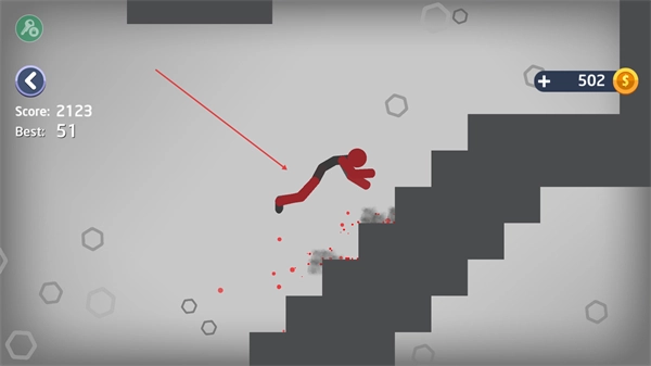 2、持续让火柴人在楼梯上碰撞、滑动,通过肢体变形、损伤等效果提升得分。