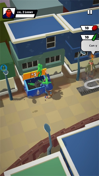 1、操控角色移动到垃圾桶位置,翻找垃圾桶获取物品如绿色道具,积累资源。