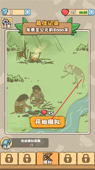 1、进入该远古时代模拟游戏界面,看到最佳记录发展至公元前8000年的提示,点击界面中的开始模拟按钮,启动游戏的发展进程。