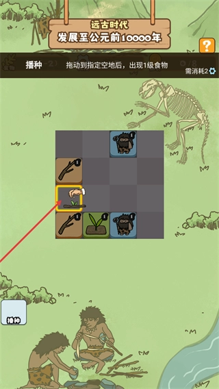 2、处于远古时代发展至公元前10000年界面时,按播种拖动到指定空地后,出现1级食物的提示,将播种拖动至指定空地来获取1级食物。