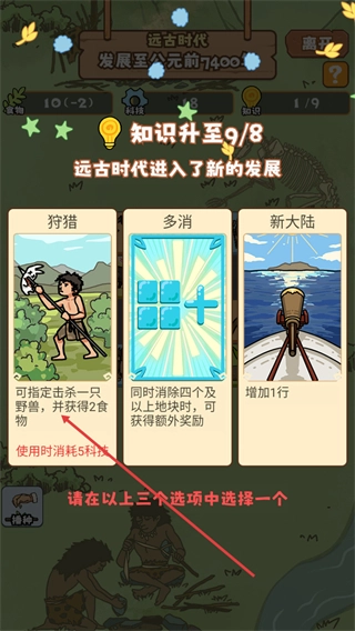 3、当出现知识升至9/8远古时代进入了新的发展提示后,从狩猎、多消、新大陆三个选项里选一个,以此解锁对应功能助力发展。