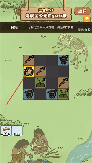 4、在远古时代发展至公元前7400年界面,利用狩猎可指定击杀一只野兽,并获得2食物功能,点击对应野兽方块消耗科技完成狩猎获取食物。