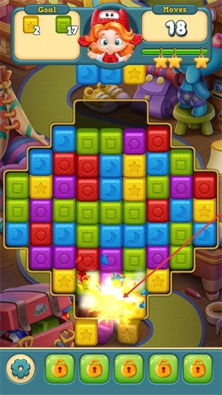 不同道具搭配可触发大范围消除特效,视觉体验爽快,要求在限定步数内消除规定的方块,能让消除过程充满期待感与趣味性。