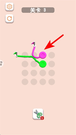 2、进入关卡后,根据箭头指引移动对应颜色的绳圈,将缠绕的绳子整理至对应位置。