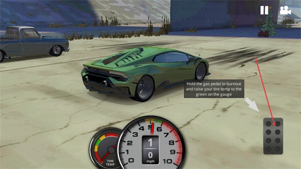 4、进入竞速比赛后,根据游戏中给出的提示,长按油门按钮将轮胎温度提至仪表绿色区。