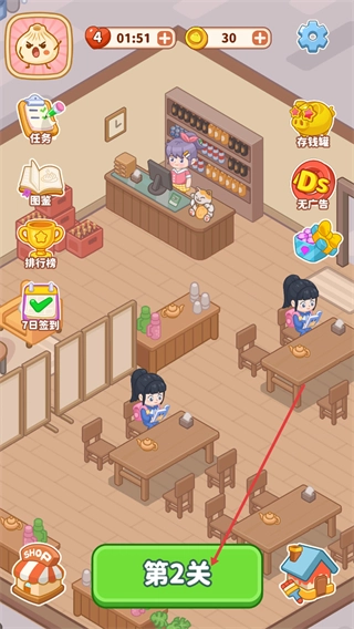 1、在主界面找到第2关按钮并点击,即可进入第二关的游戏环节,继续进行点心打包的相关任务。