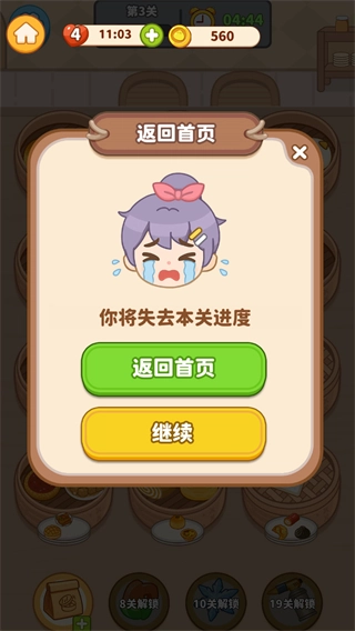 2、查看蒸屉提示中的完成订单解锁新蒸屉说明,点击下方的确定按钮,关闭提示后开始该关卡的操作。